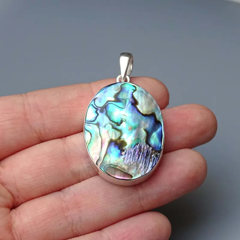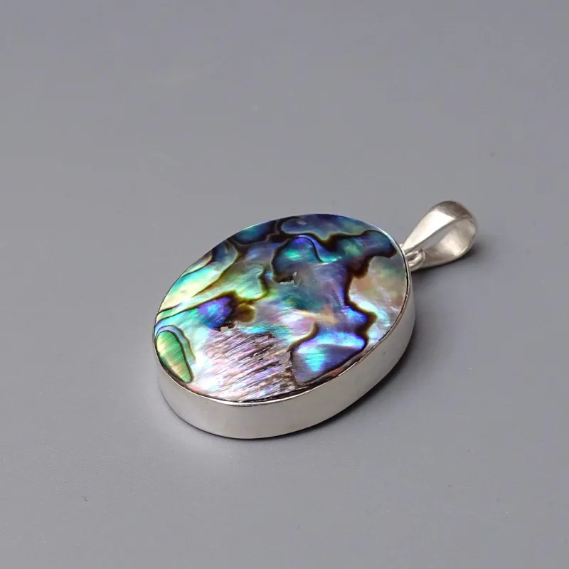 Přívěšek z mušle Abalone/Paua, krásný barevný perleťový efekt ve stříbře. Paua je považována za „perlu oceánu“ Nového Zélandu. Tamní mořská voda a minerální prostředí způsobují její výraznou, téměř duhovou iridescenci, kterou nenajdeme u žádného jiného druhu abalonu na světě.