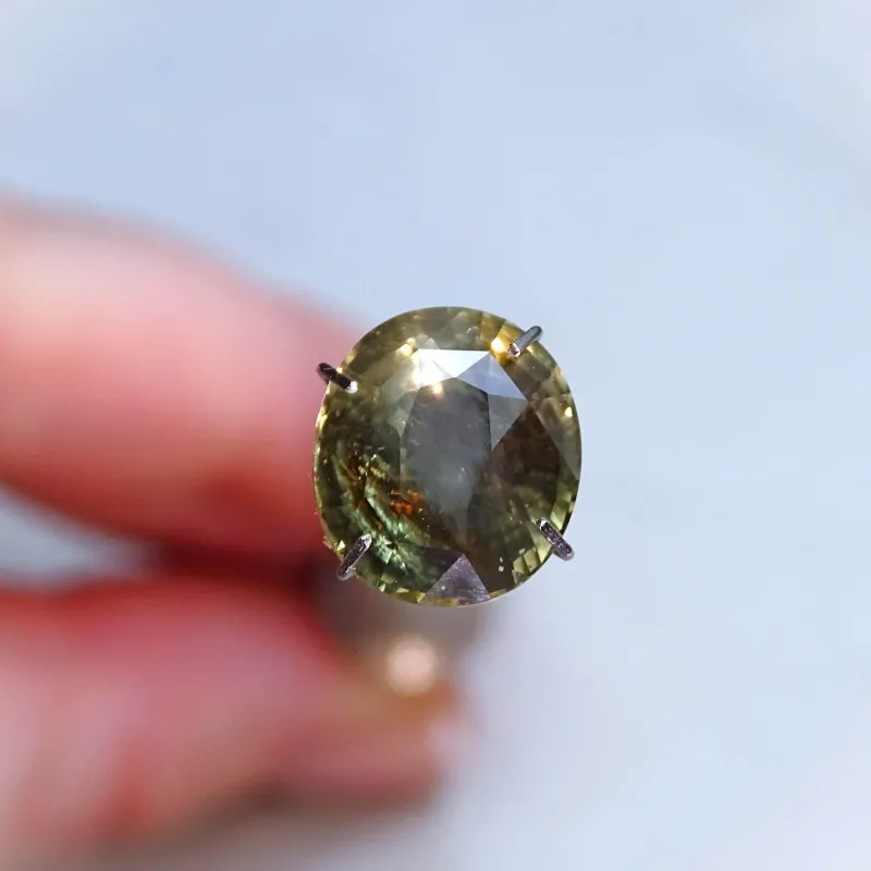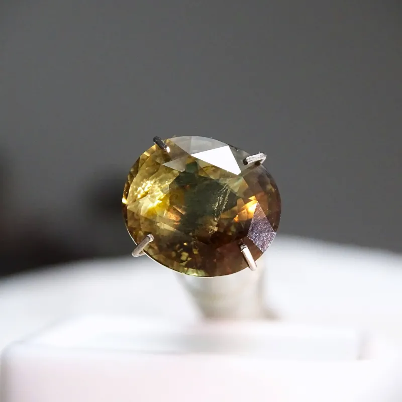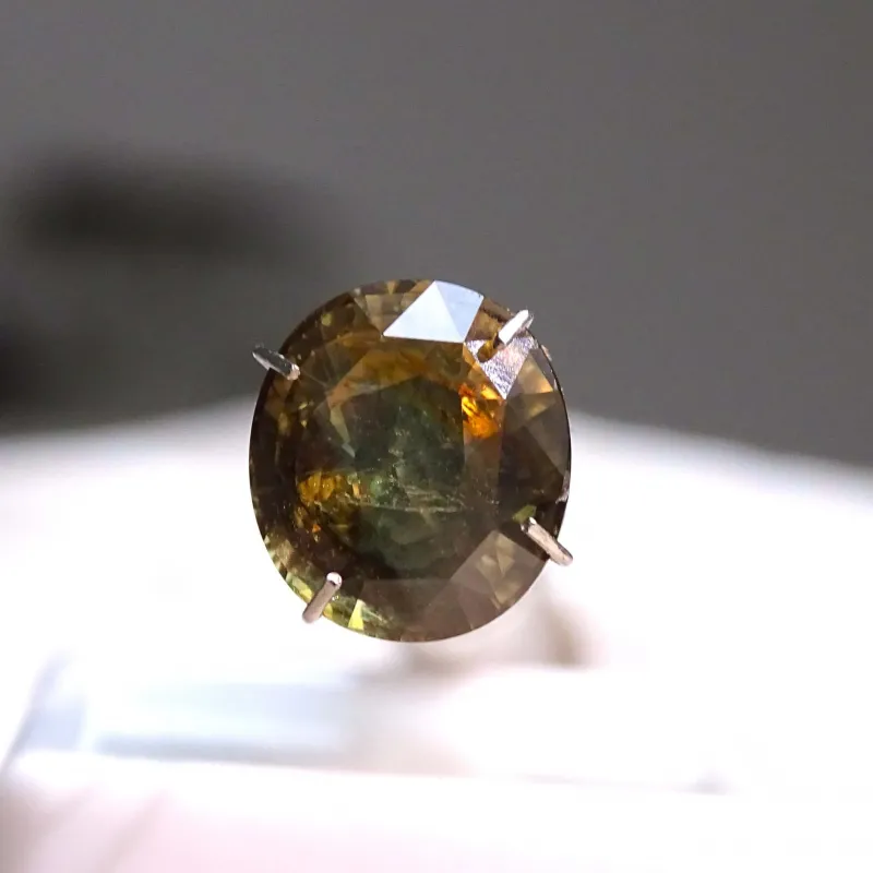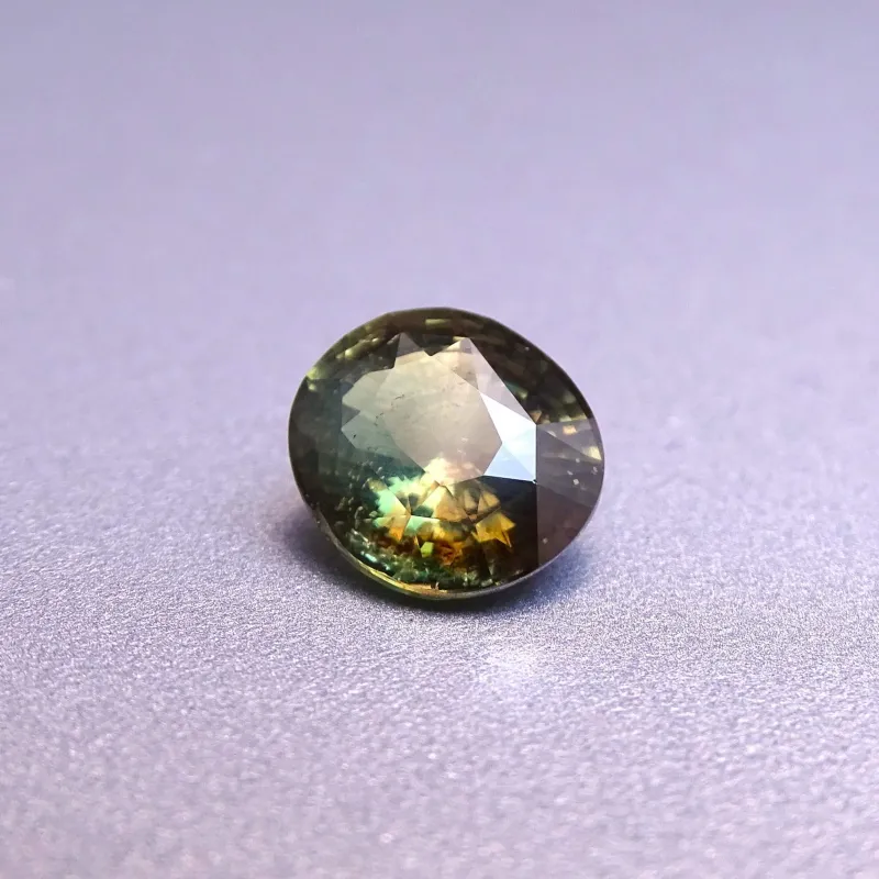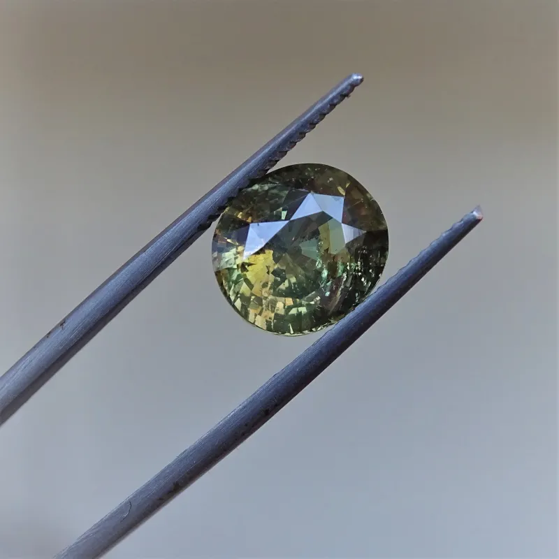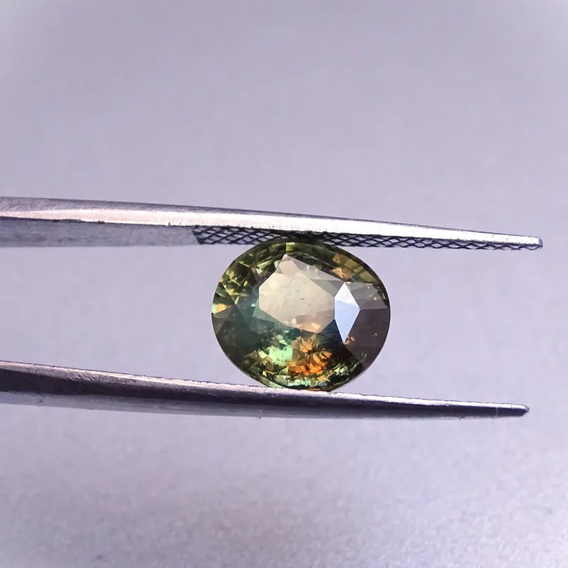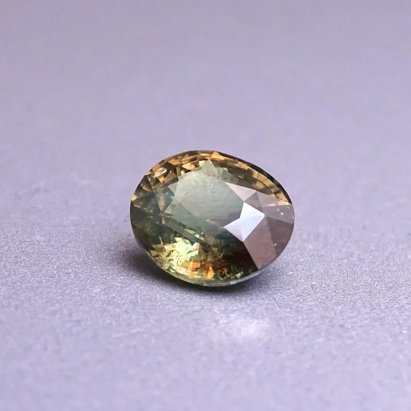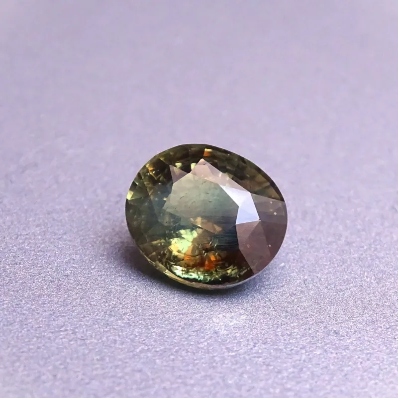 Vzácná odrůda chryzoberylu (BeAl₂O₄) se silnou změnou barvy – zelená v denním světle, červená/purpurová v žárovkovém.