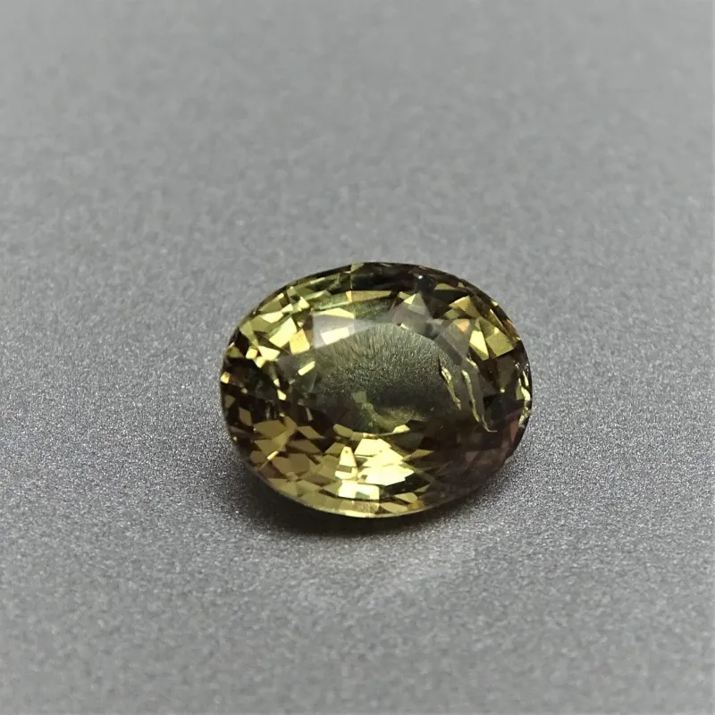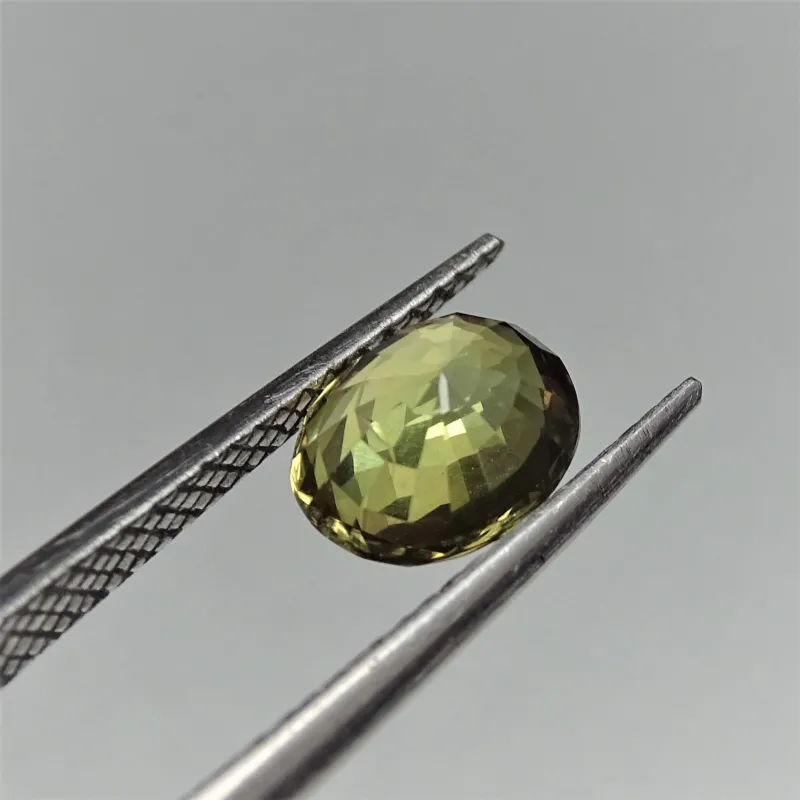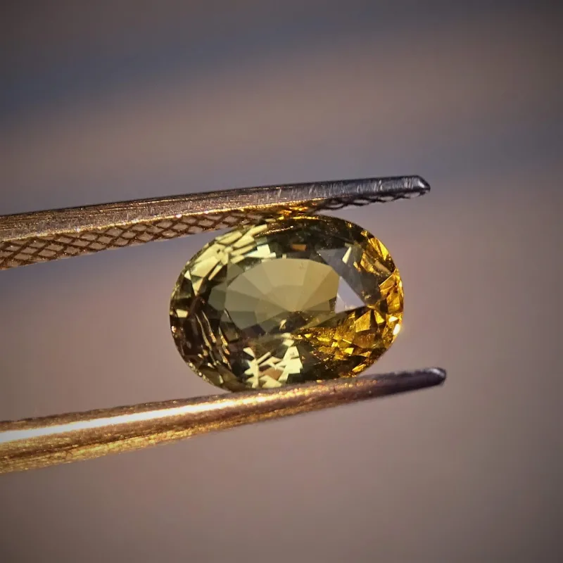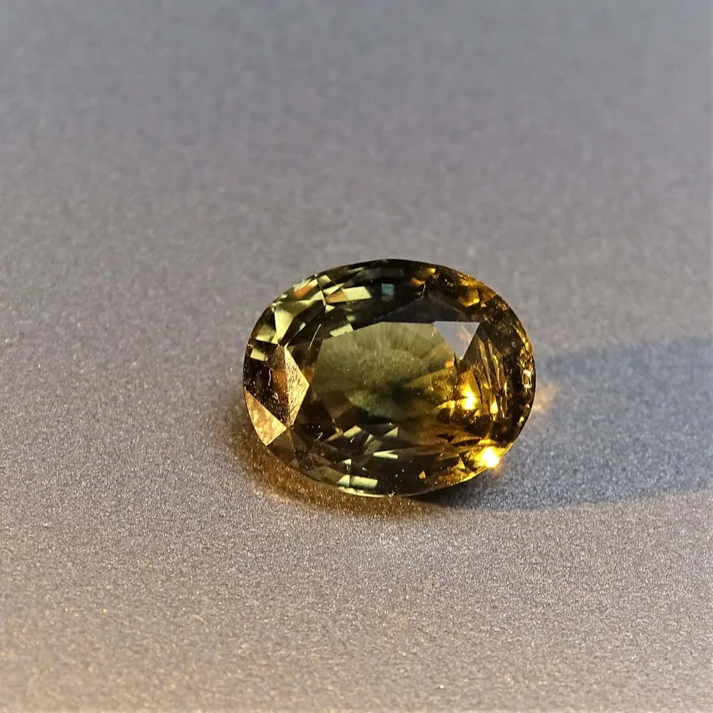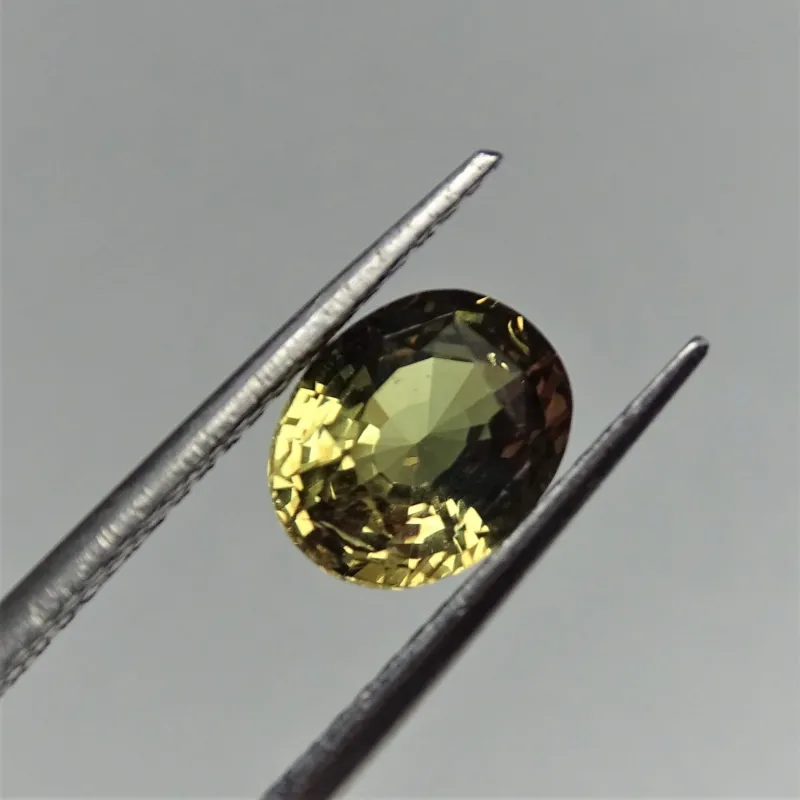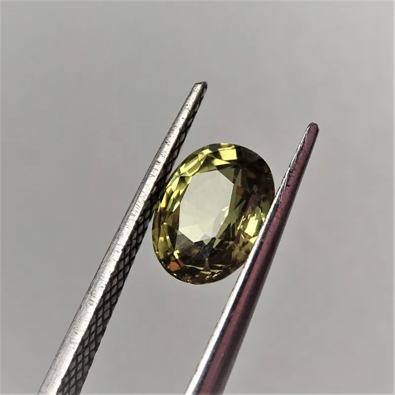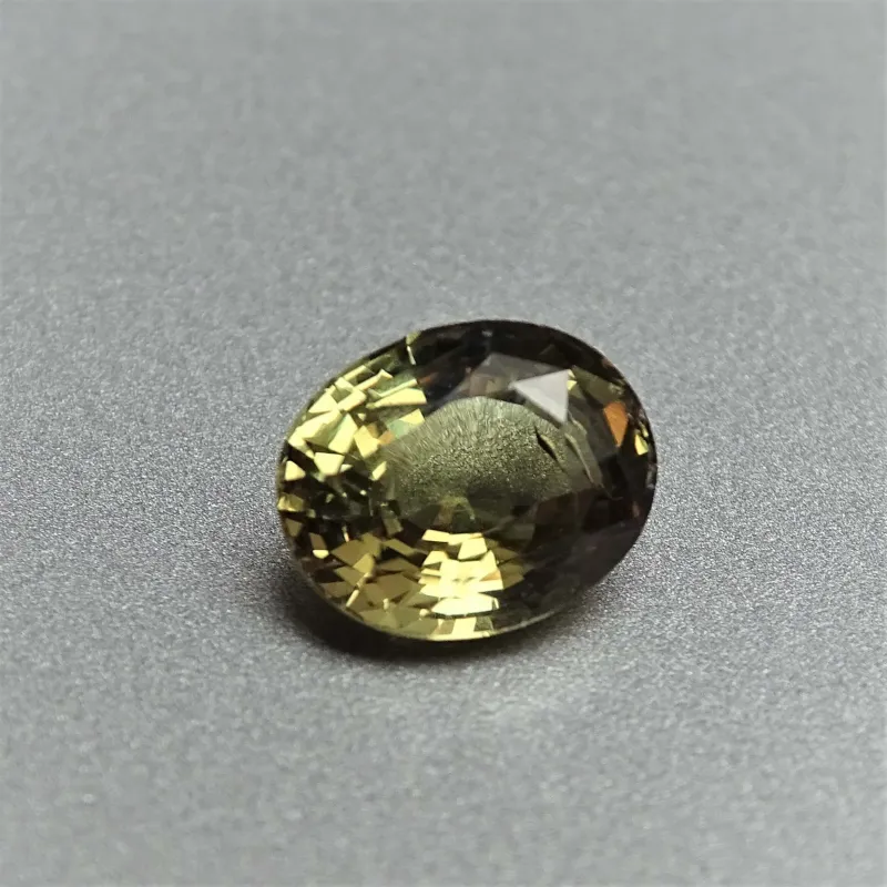 Vzácná odrůda chryzoberylu (BeAl₂O₄) se silnou změnou barvy – zelená v denním světle, červená/purpurová v žárovkovém.