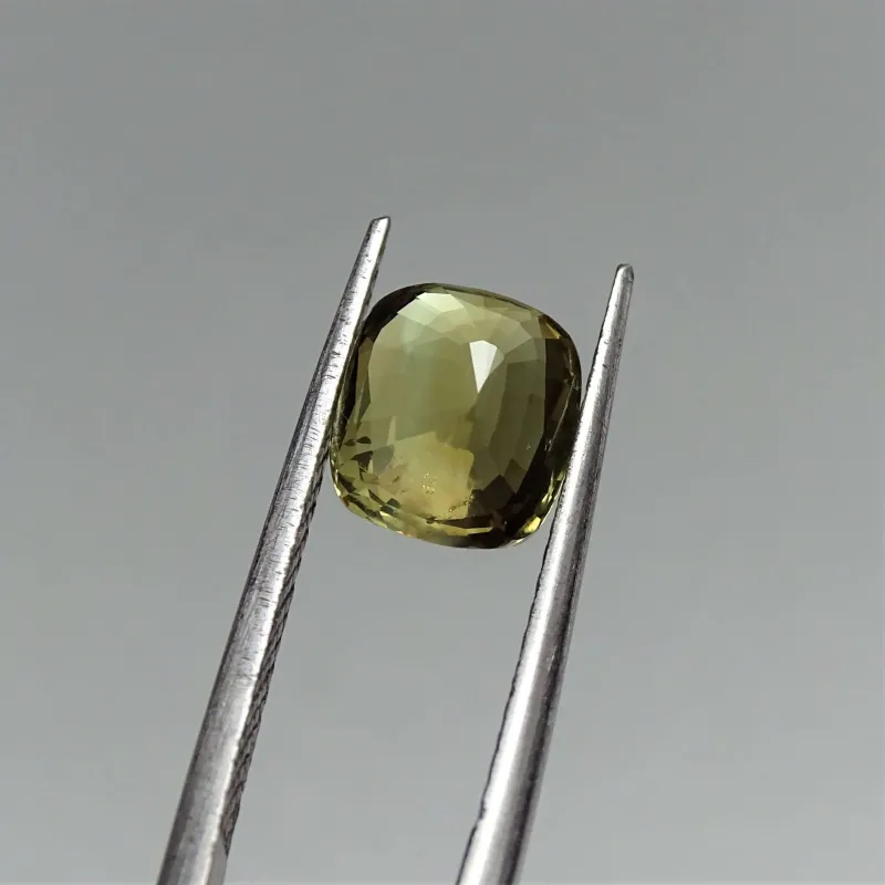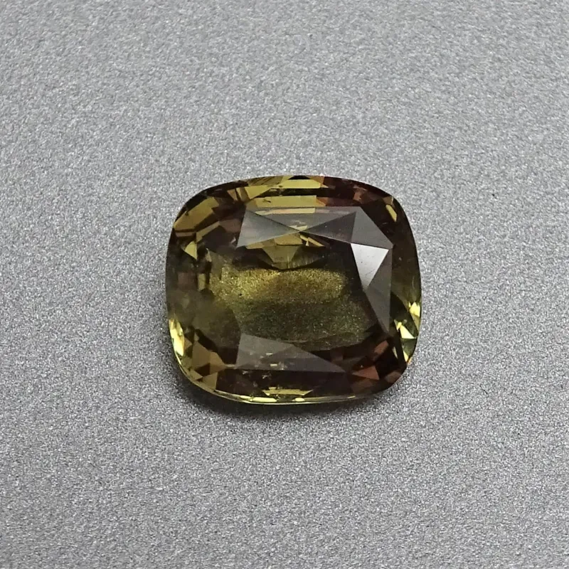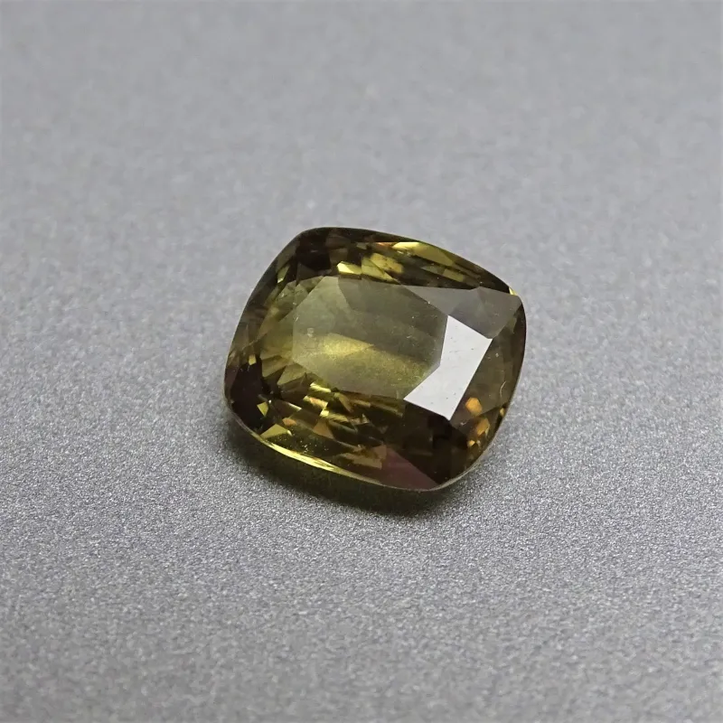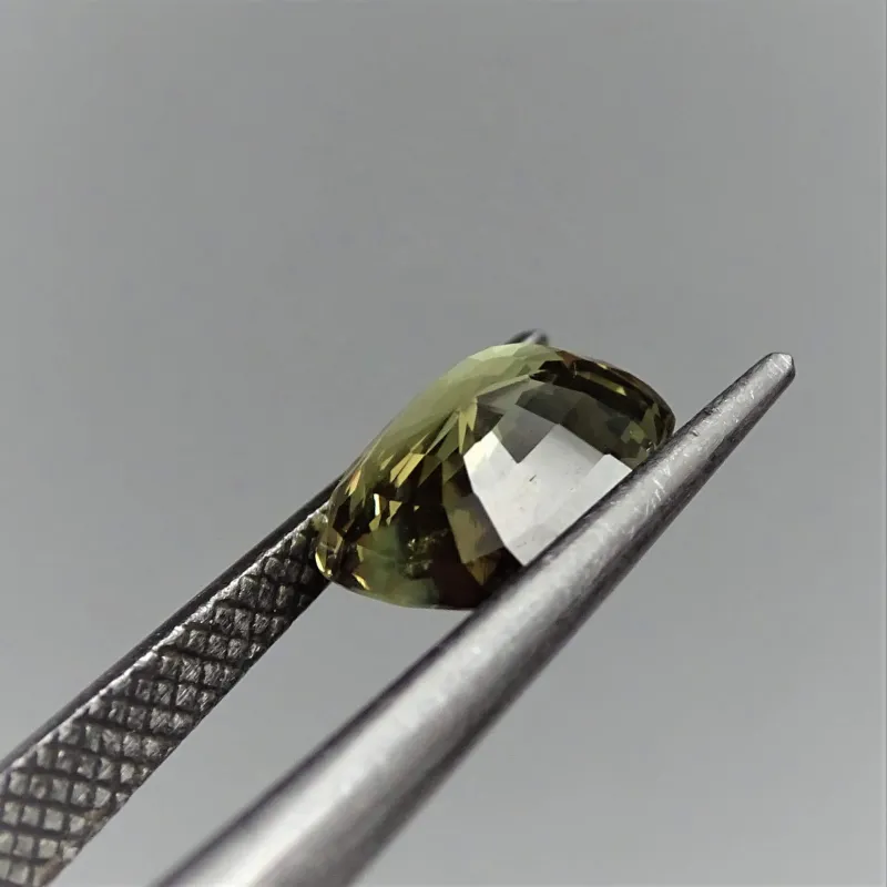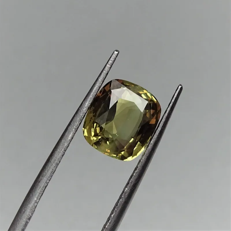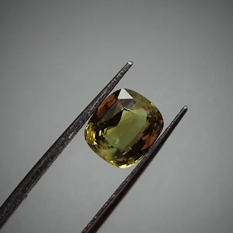 Vzácná odrůda chryzoberylu (BeAl₂O₄) se silnou změnou barvy – zelená v denním světle, červená/purpurová v žárovkovém.