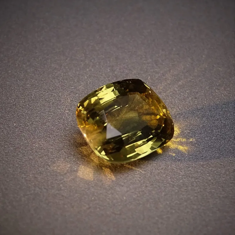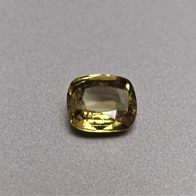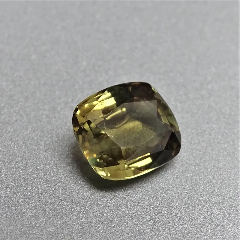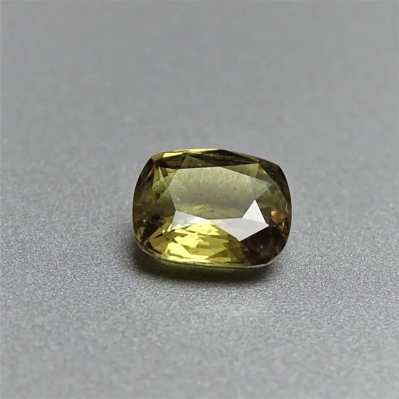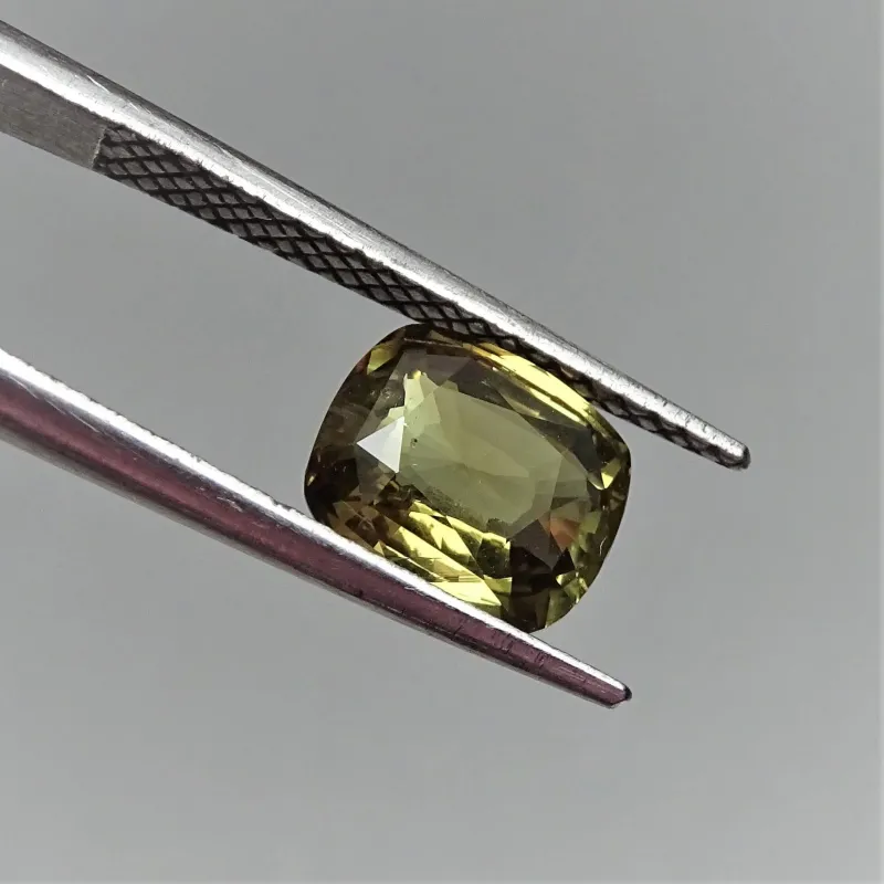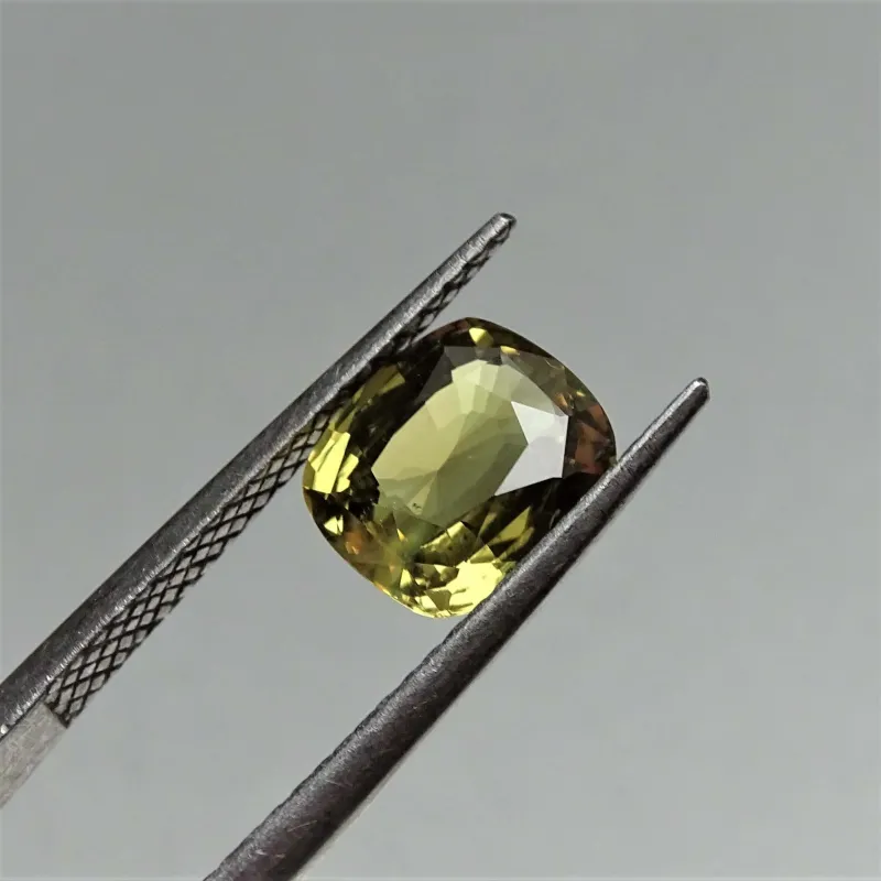 Vzácná odrůda chryzoberylu (BeAl₂O₄) se silnou změnou barvy – zelená v denním světle, červená/purpurová v žárovkovém.