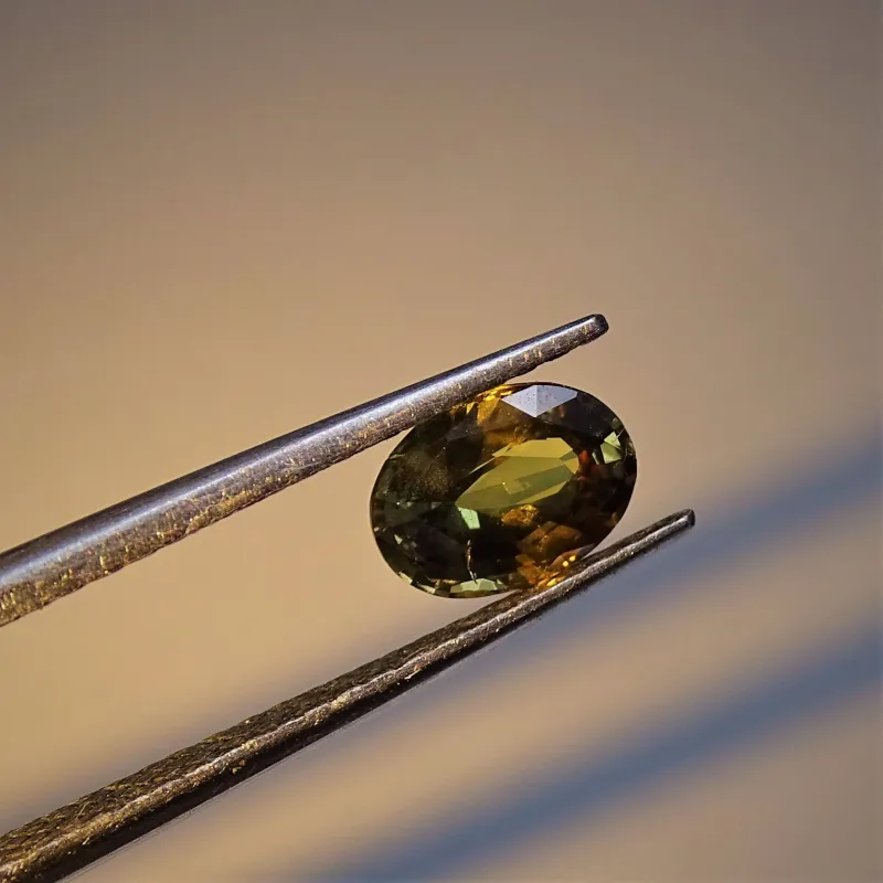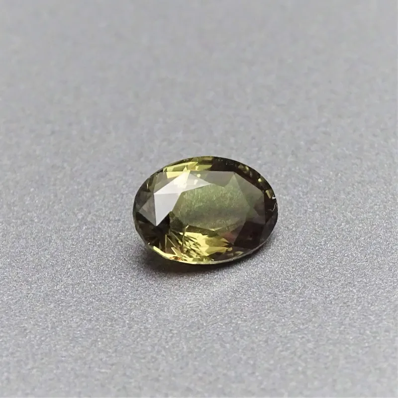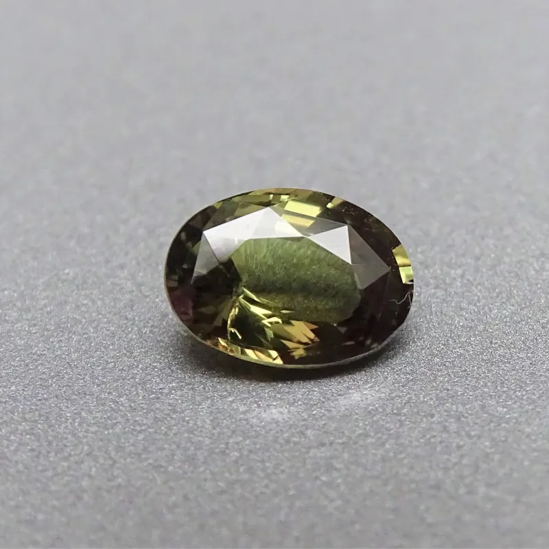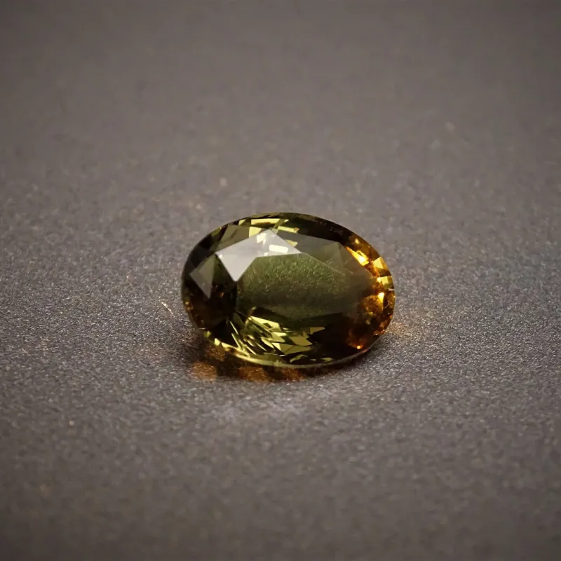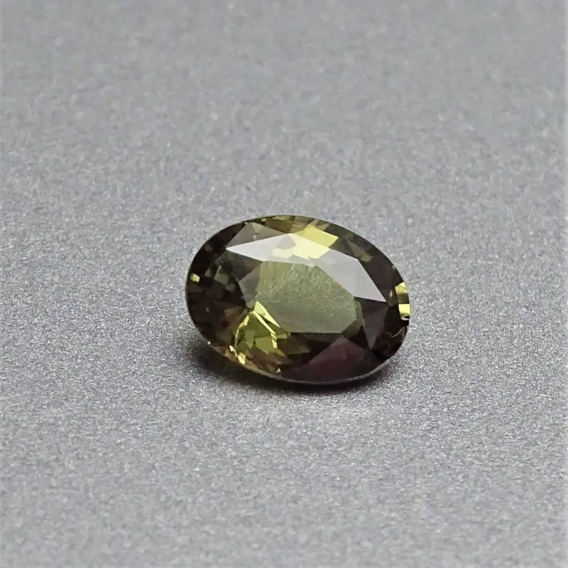 Vzácná odrůda chryzoberylu (BeAl₂O₄) se silnou změnou barvy – zelená v denním světle, červená/purpurová v žárovkovém.