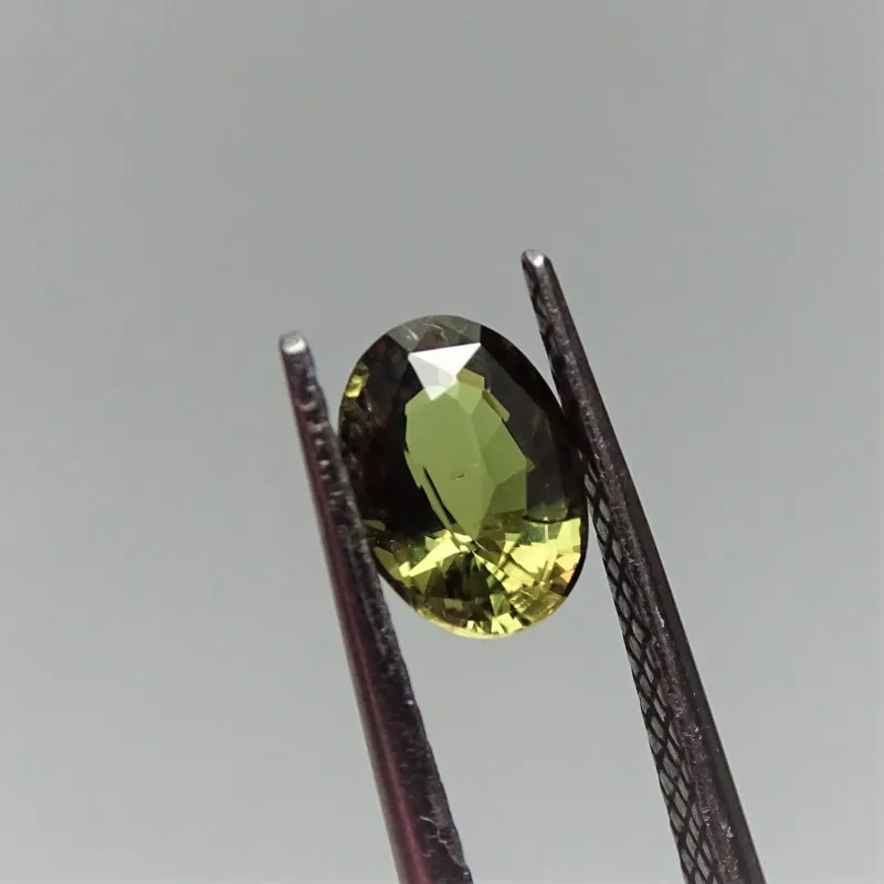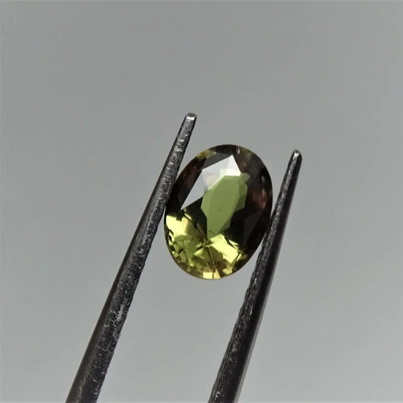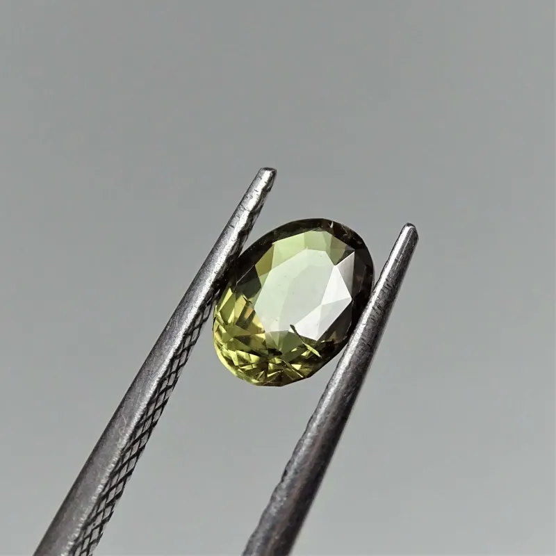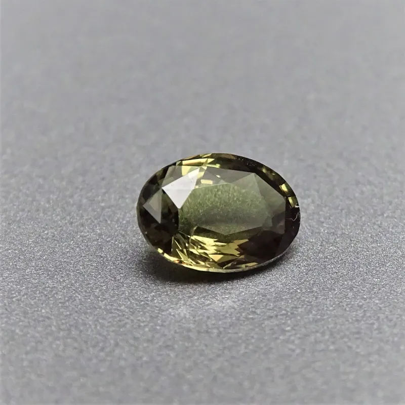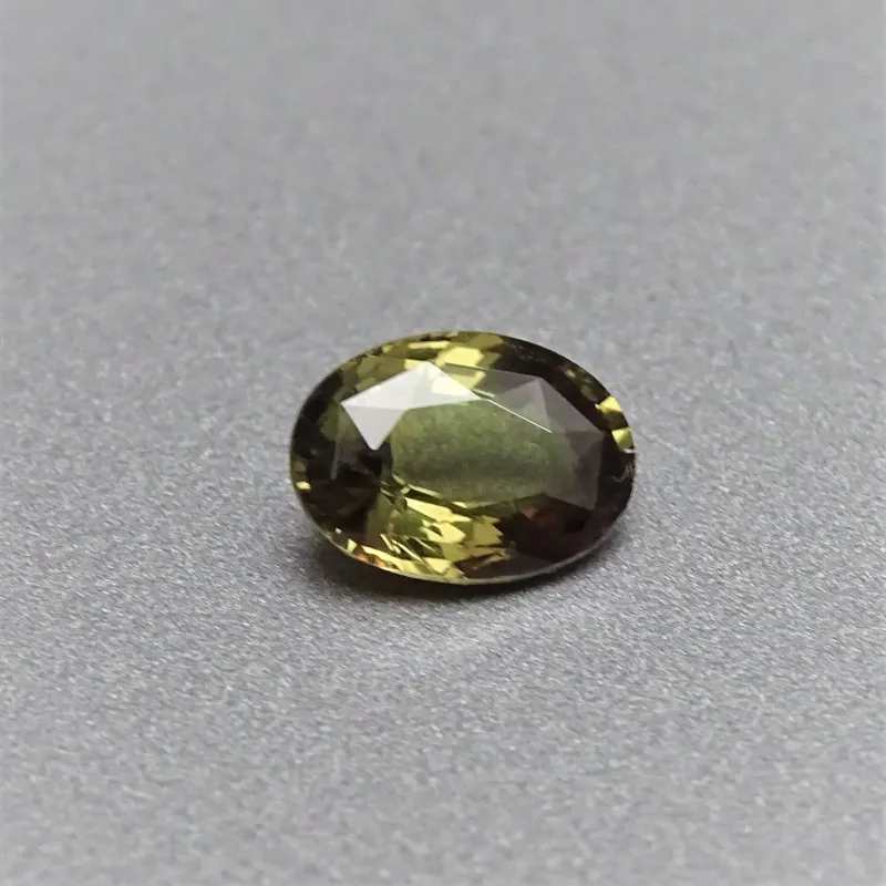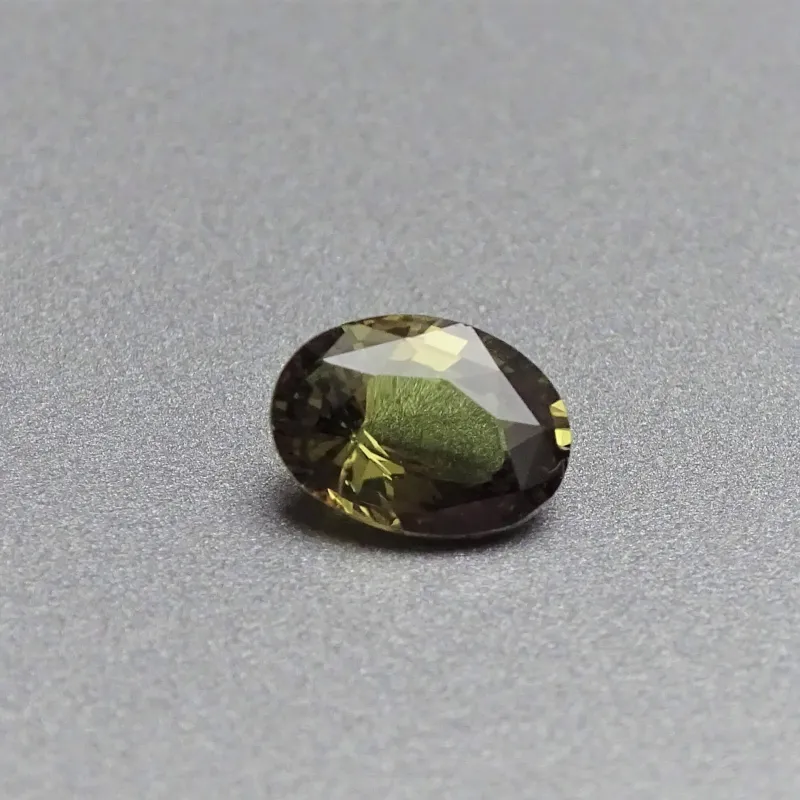 Vzácná odrůda chryzoberylu (BeAl₂O₄) se silnou změnou barvy – zelená v denním světle, červená/purpurová v žárovkovém.