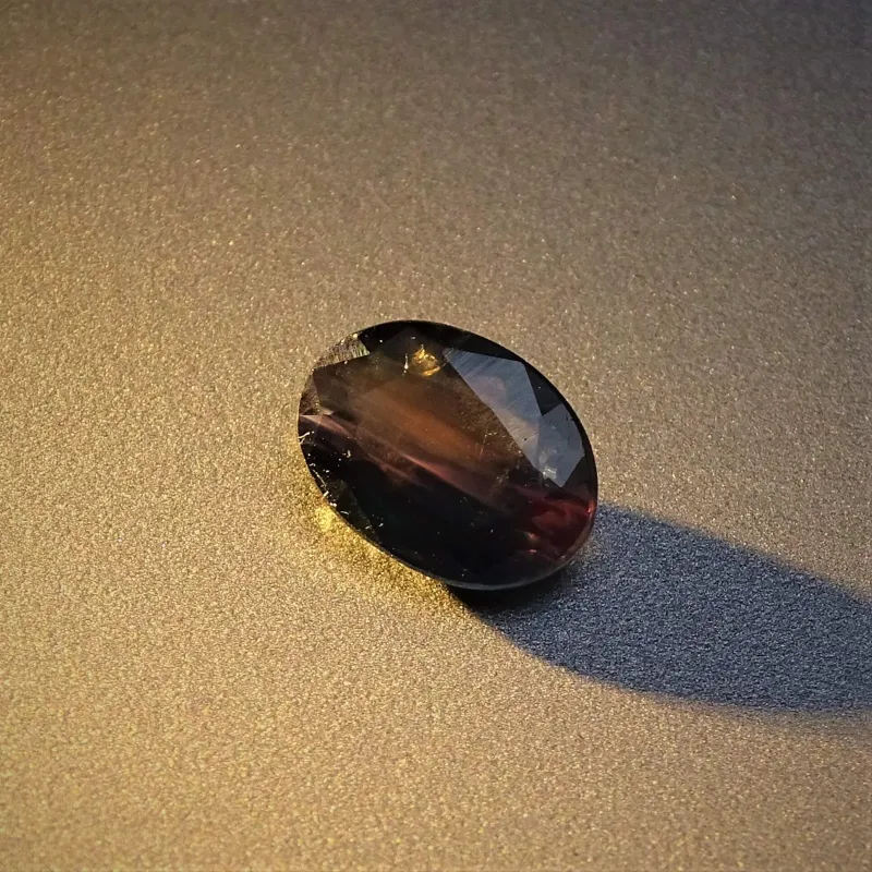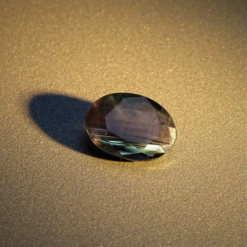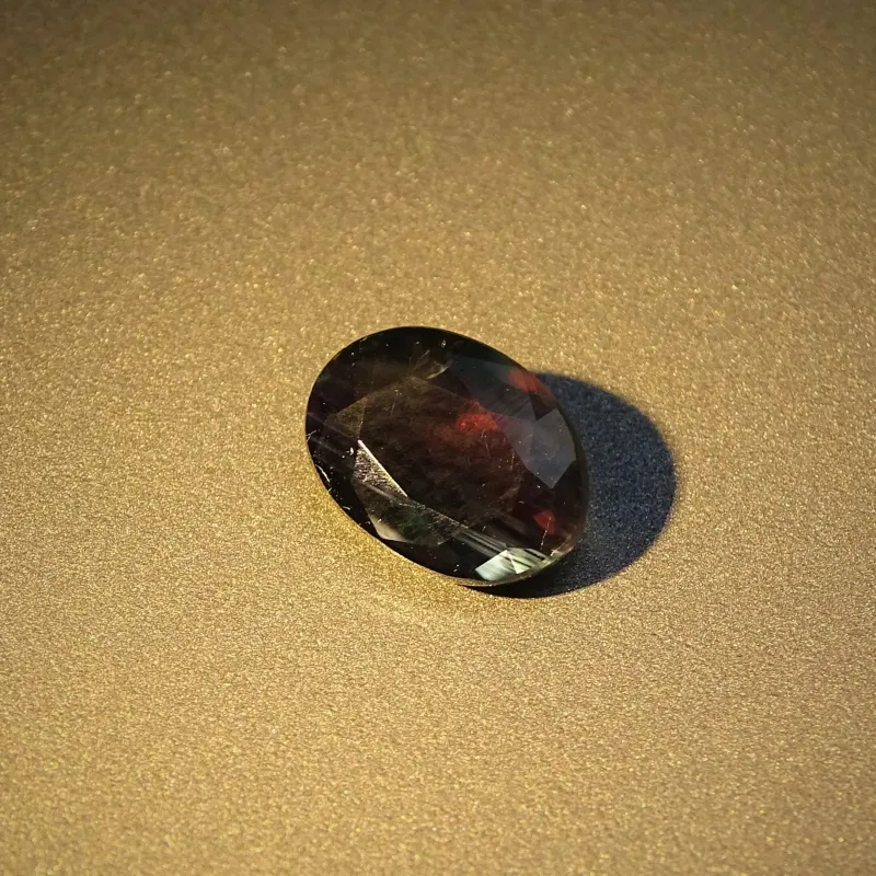 Vzácná odrůda chryzoberylu (BeAl₂O₄) se silnou změnou barvy – zelená v denním světle, červená/purpurová v žárovkovém.